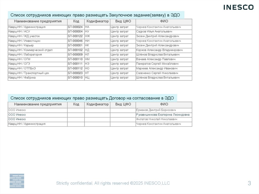 Список сотрудников имеющих право размещать Закупочное задание(заявку) в ЭДОНаименование предприятия