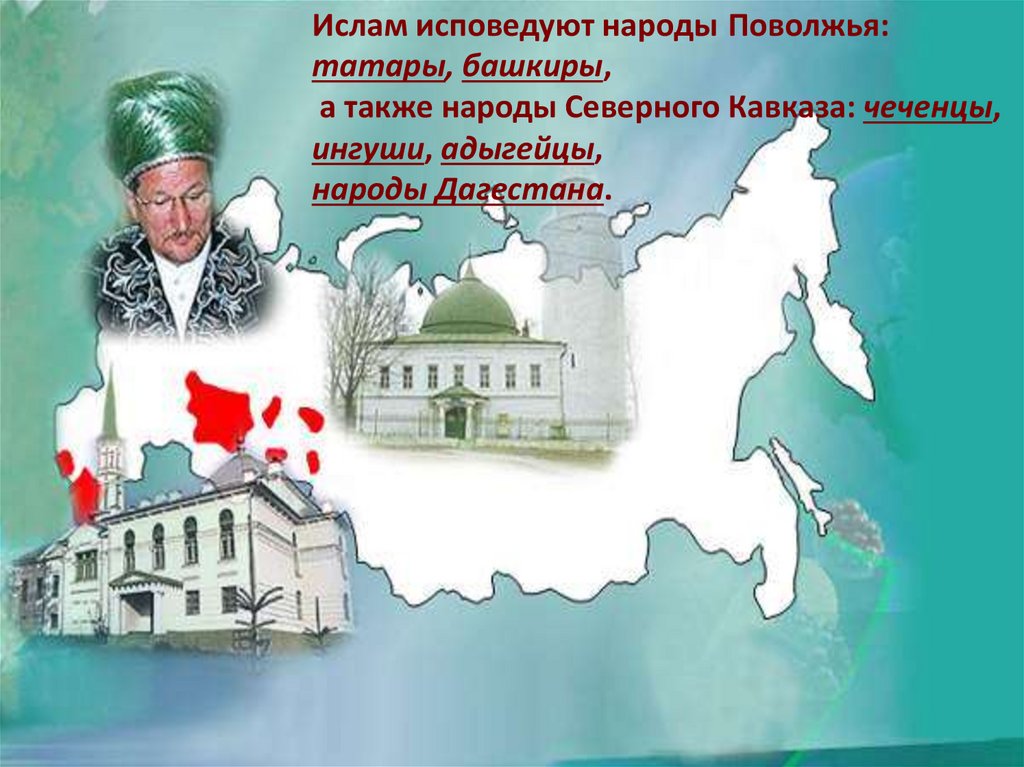 Ислам исповедуют народы Поволжья:татары, башкиры,