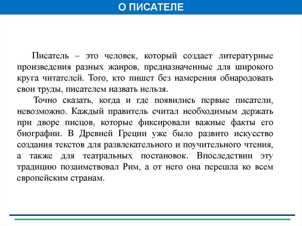 О ПИСАТЕЛЕПисатель – это человек, который создает литературные