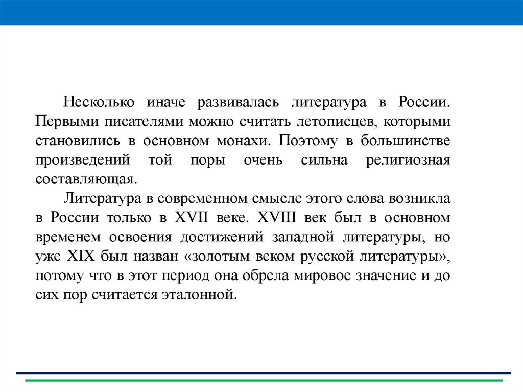 Несколько иначе развивалась литература в России.Первыми писателями можно считать летописцев, которыми