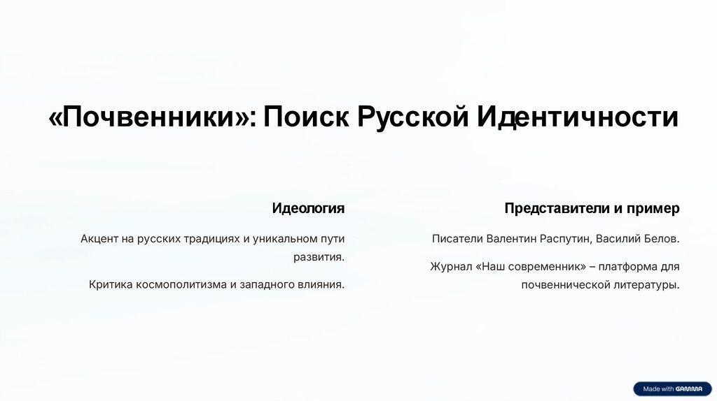«Почвенники»: Поиск Русской ИдентичностиИдеология