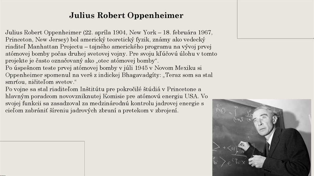 Julius Robert OppenheimerJulius Robert Oppenheimer (22. apríla 1904, New York – 18. februára 1967,