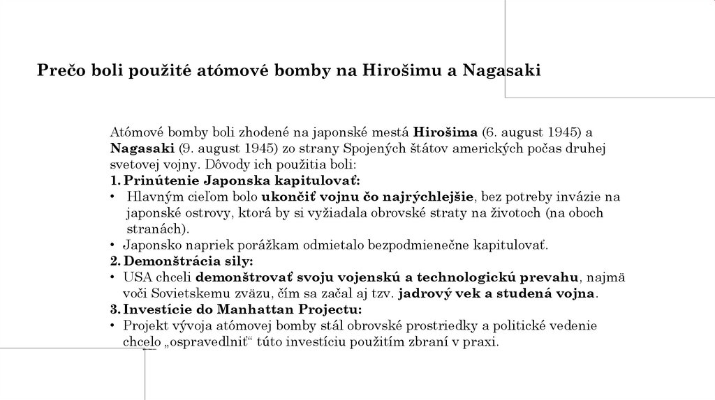 Prečo boli použité atómové bomby na Hirošimu a NagasakiAtómové bomby boli zhodené na japonské mestá Hirošima (6. august 1945) a