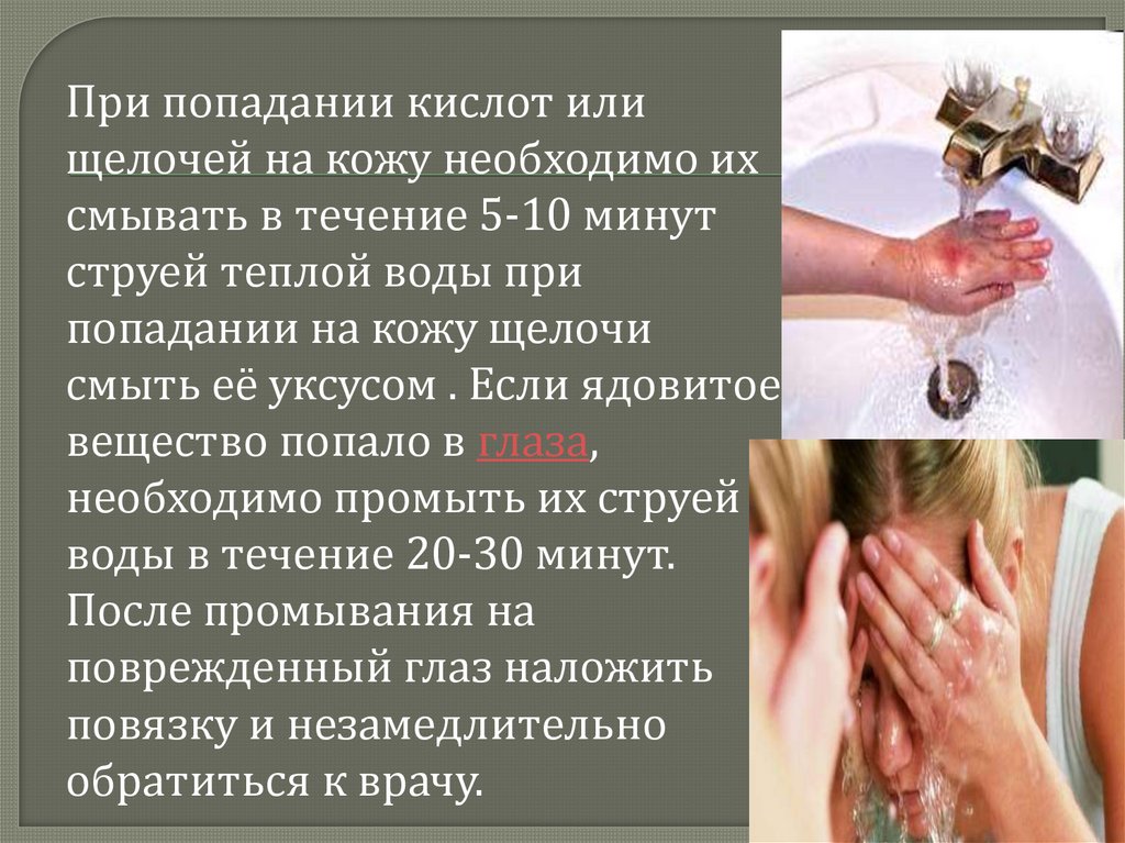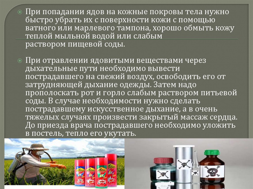 При попадании ядов на кожные покровы тела нужнобыстро убрать их с поверхности кожи с помощью
