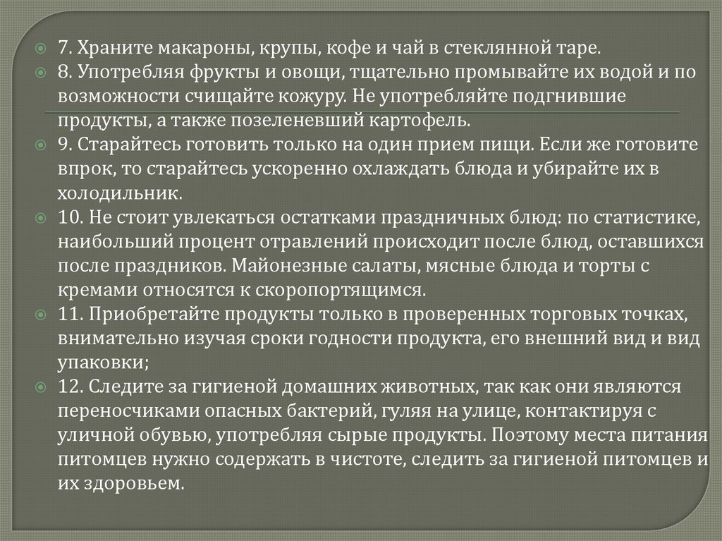7. Храните макароны, крупы, кофе и чай в стеклянной таре.8. Употребляя фрукты и овощи, тщательно промывайте их водой и по