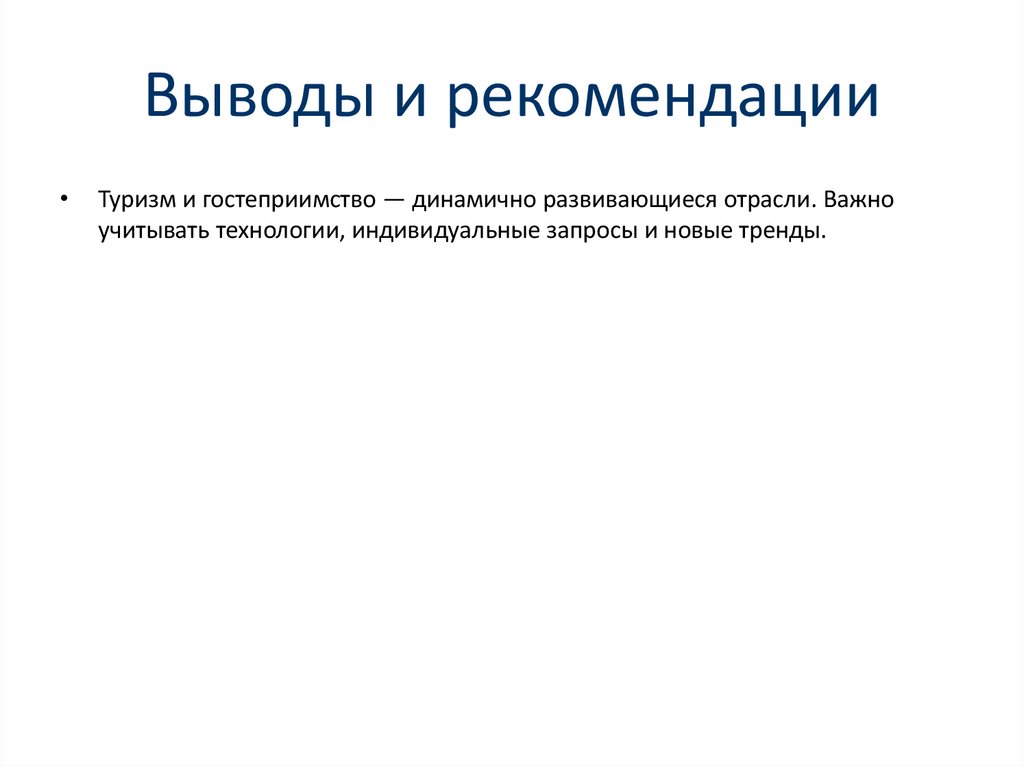 Выводы и рекомендацииТуризм и гостеприимство — динамично развивающиеся отрасли. Важно