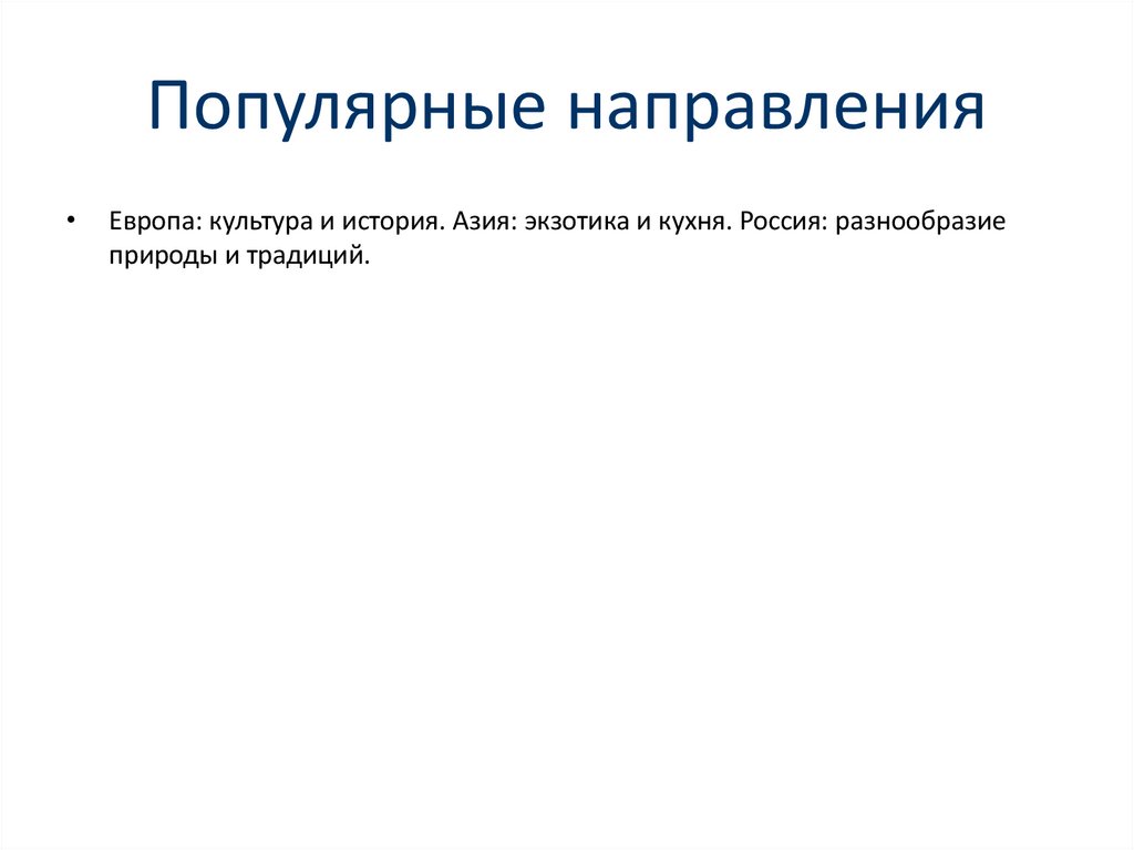 Популярные направленияЕвропа: культура и история. Азия: экзотика и кухня. Россия: разнообразие