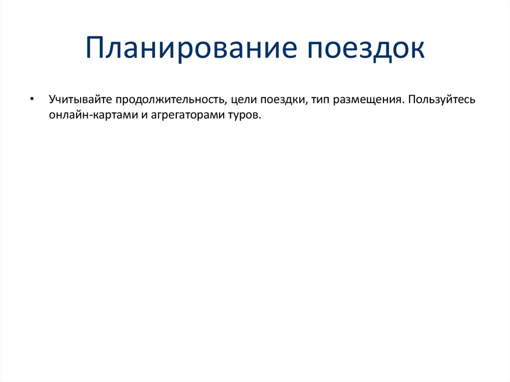 Планирование поездокУчитывайте продолжительность, цели поездки, тип размещения. Пользуйтесь