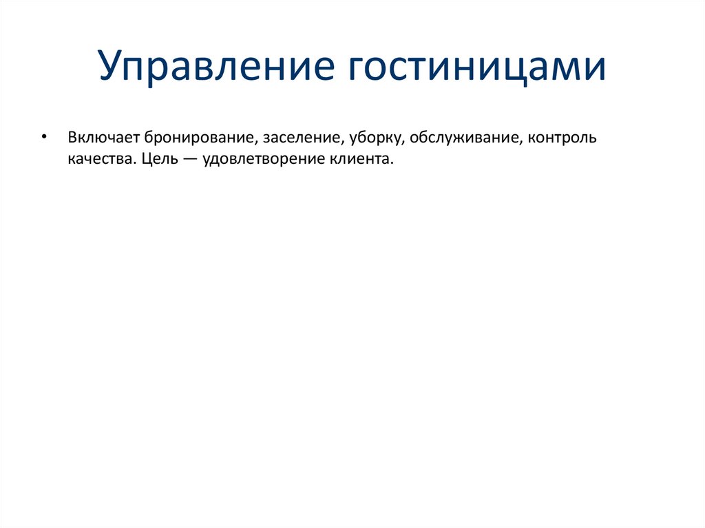 Управление гостиницамиВключает бронирование, заселение, уборку, обслуживание, контроль