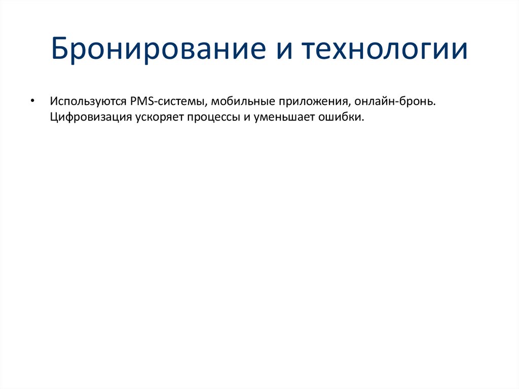Бронирование и технологииИспользуются PMS-системы, мобильные приложения, онлайн-бронь.