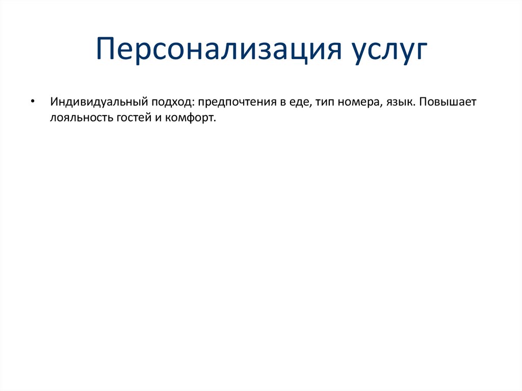 Персонализация услугИндивидуальный подход: предпочтения в еде, тип номера, язык. Повышает