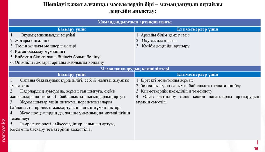 Шешілуі қажет алғашқы мәселелердің бірі – маманданудың оңтайлыдеңгейін анықтау: