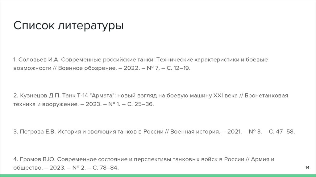 Список литературы1. Соловьев И.А. Современные российские танки: Технические характеристики и боевые
