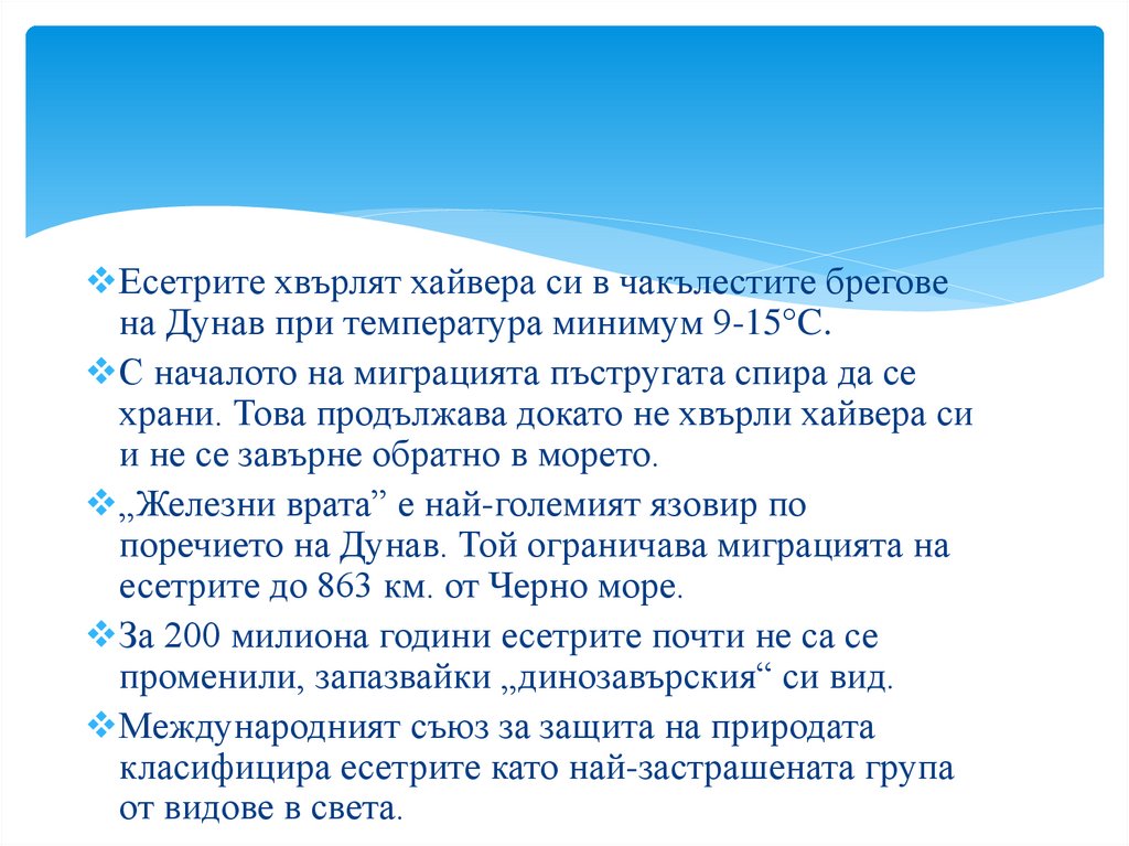 Есетрите хвърлят хайвера си в чакълестите бреговена Дунав при температура минимум 9-15°C.