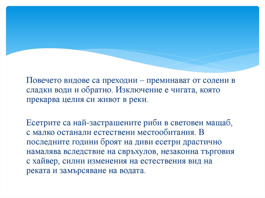 Повечето видове са преходни – преминават от солени всладки води и обратно. Изключение е чигата, която