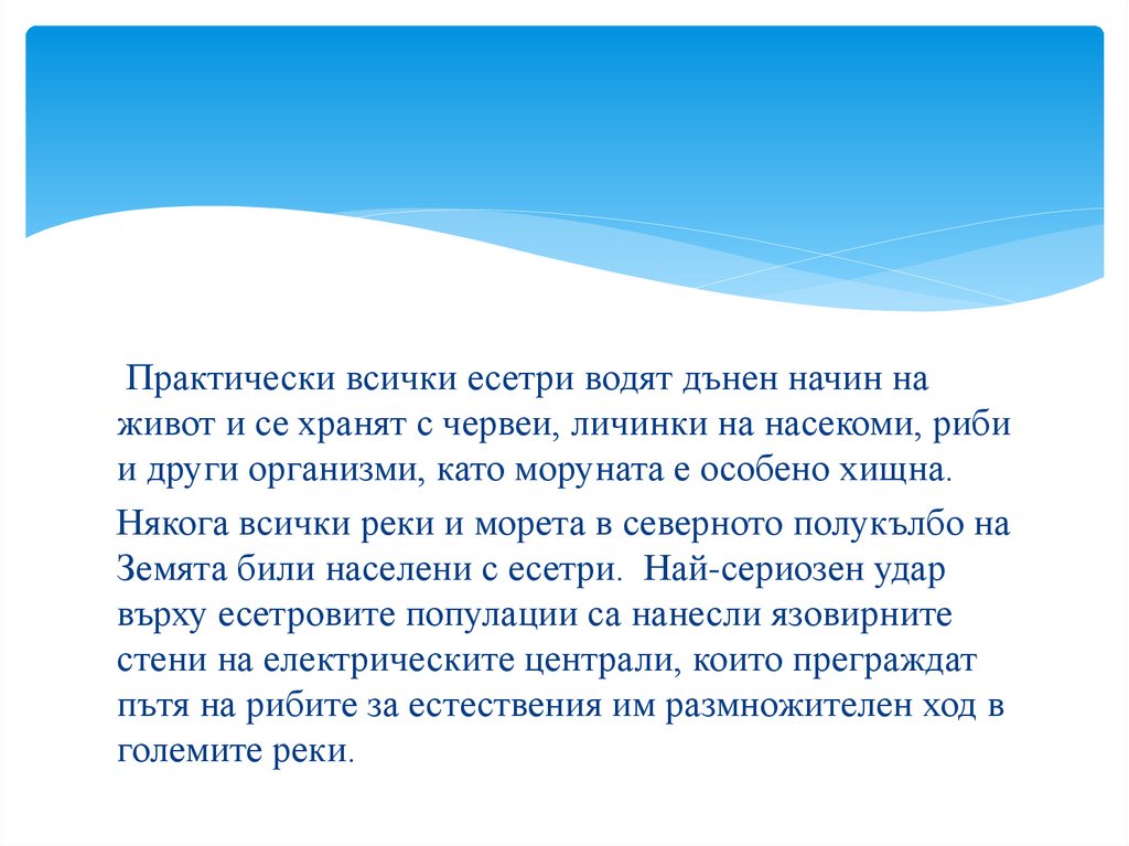 Практически всички есетри водят дънен начин наживот и се хранят с червеи, личинки на насекоми, риби