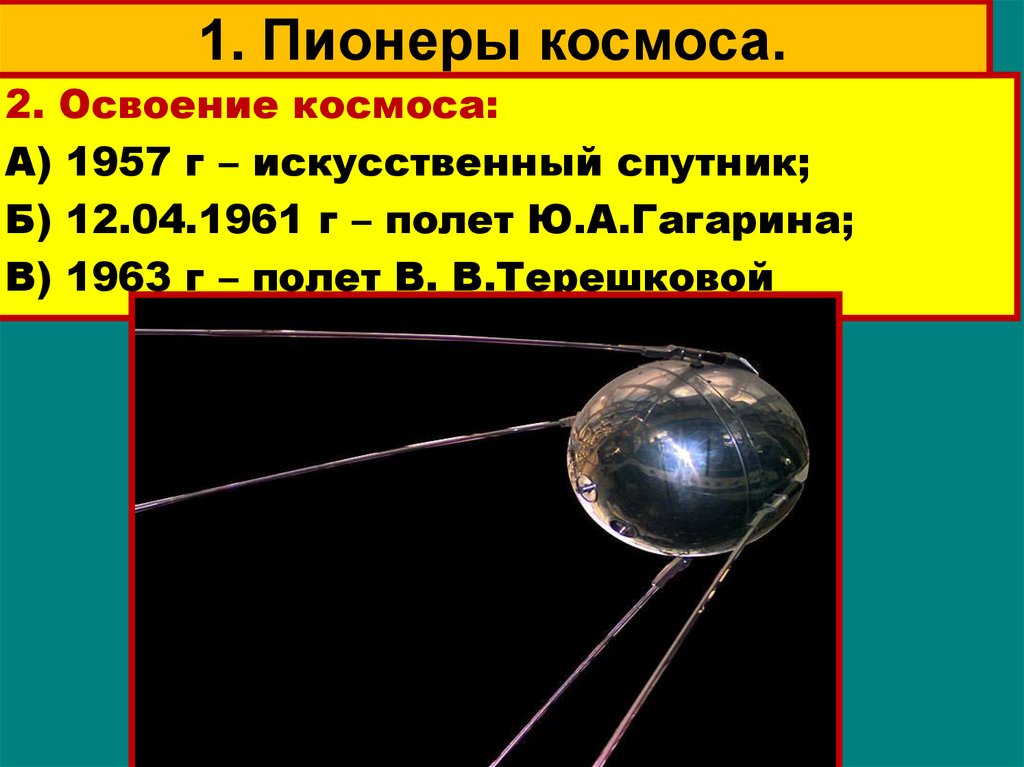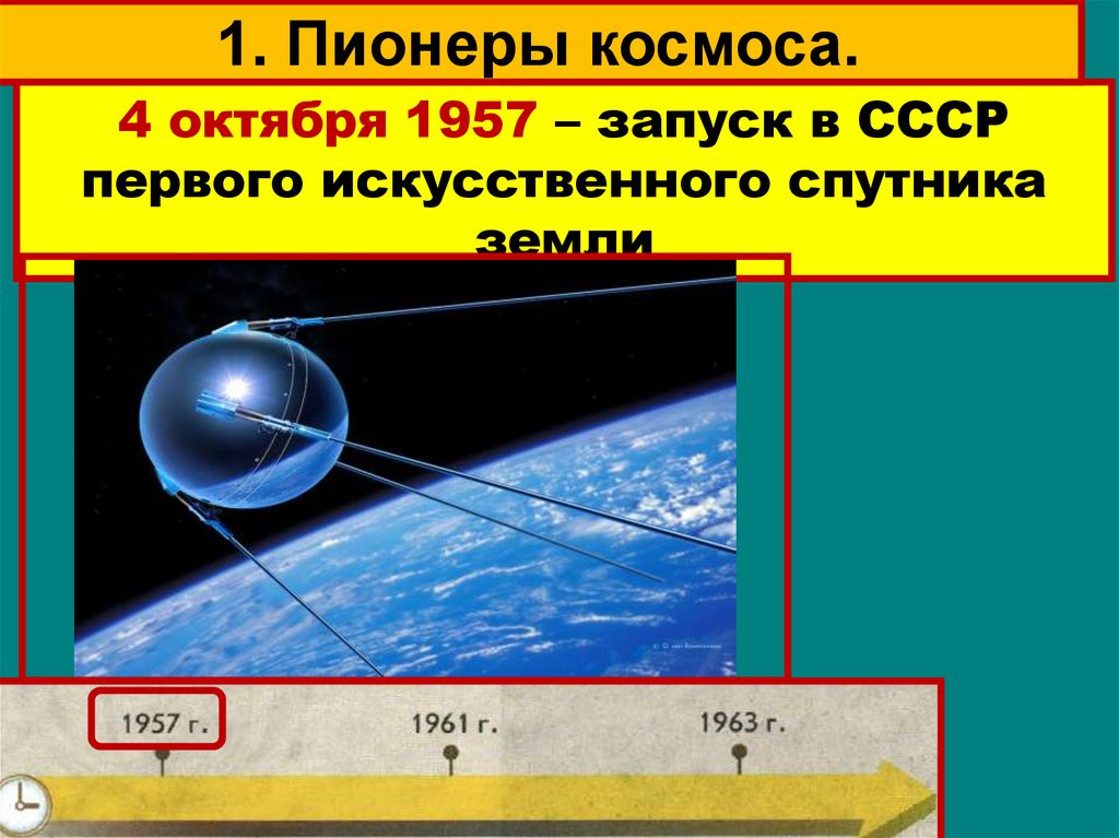 1. Пионеры космоса.4 октября 1957 – запуск в СССР