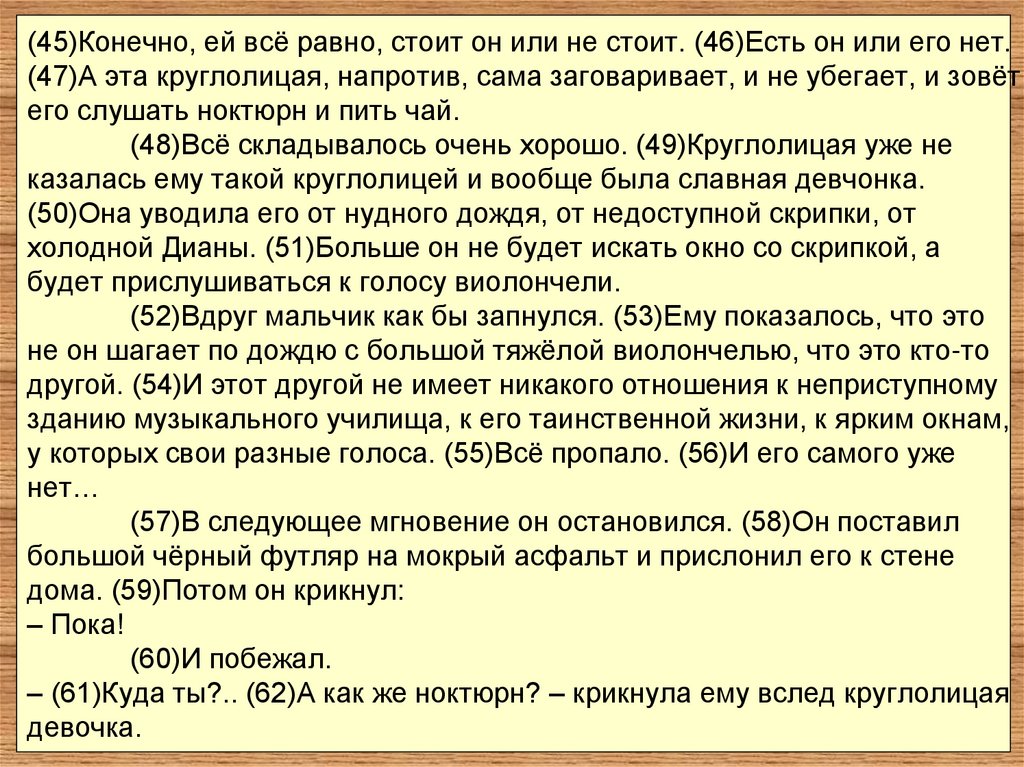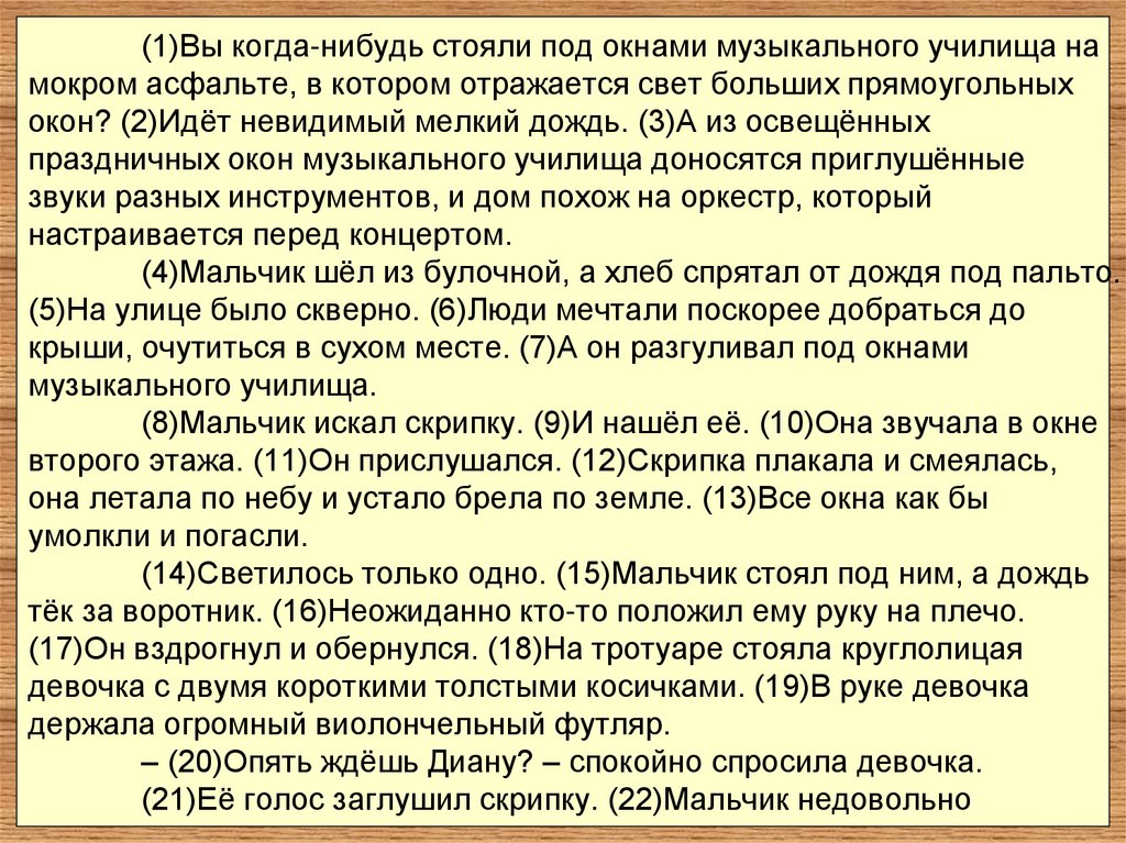 (8)Мальчик искал скрипку. (9)И нашёл её. (10)Она звучала в окне