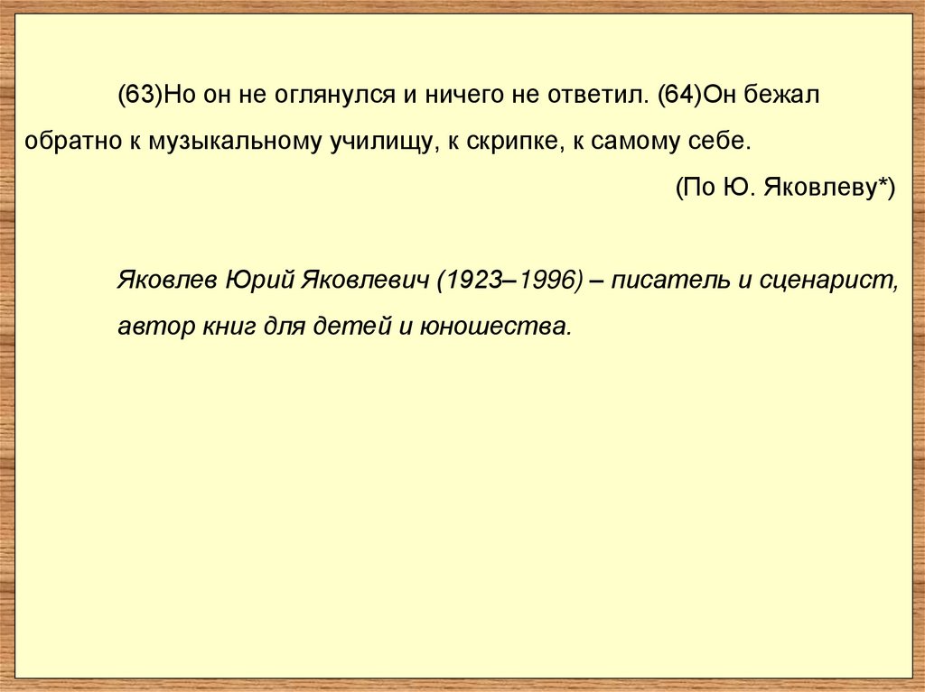 (63)Но он не оглянулся и ничего не ответил. (64)Он бежалобратно к музыкальному училищу, к скрипке, к самому себе.
