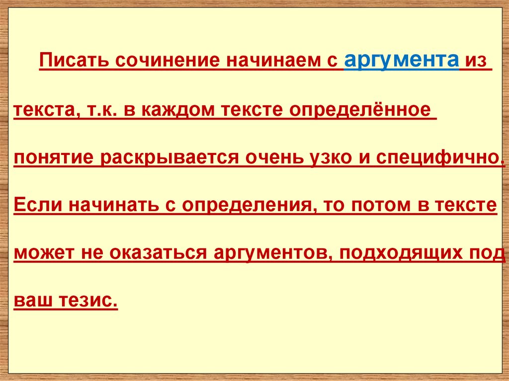 Писать сочинение начинаем с аргумента изтекста, т.к. в каждом тексте определённое
