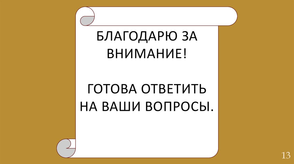 13. Благодарю за внимание! Готова ответить на ваши вопросы.