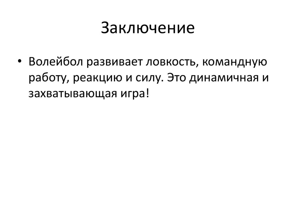 Заключение• Волейбол развивает ловкость, командную