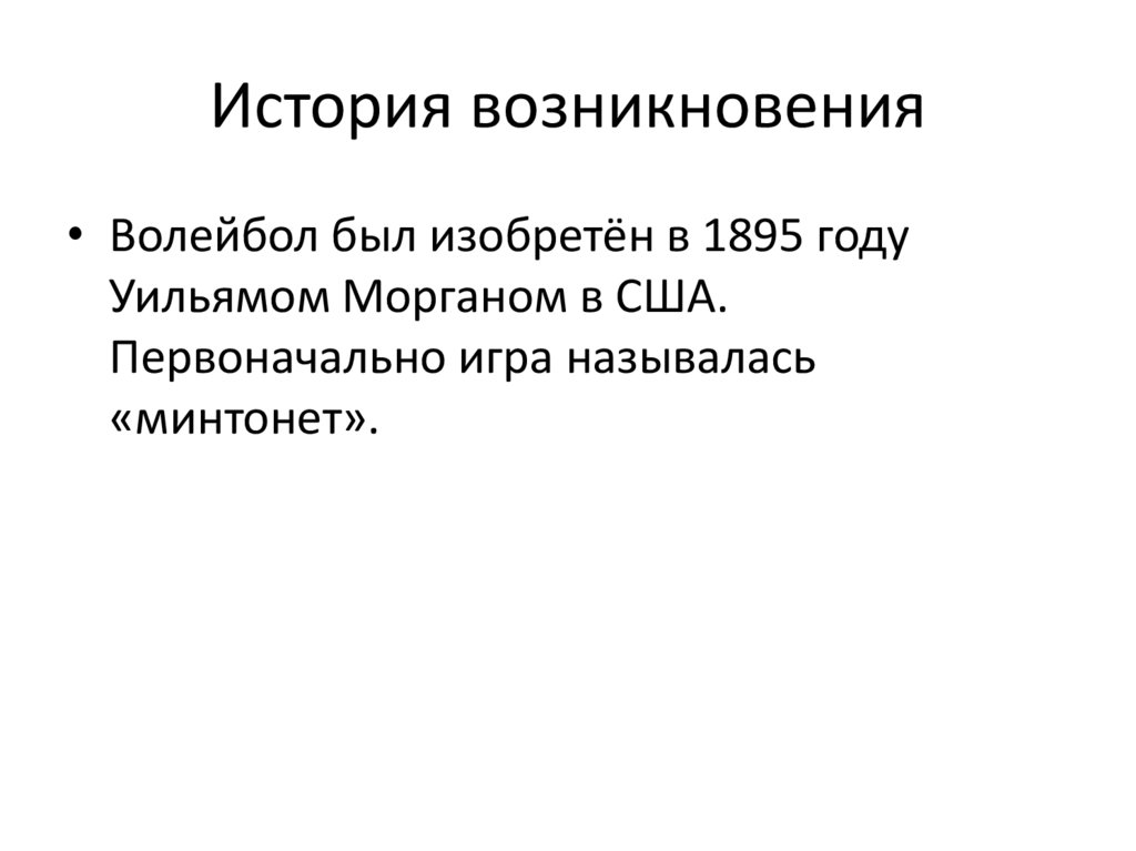 История возникновения• Волейбол был изобретён в 1895 году