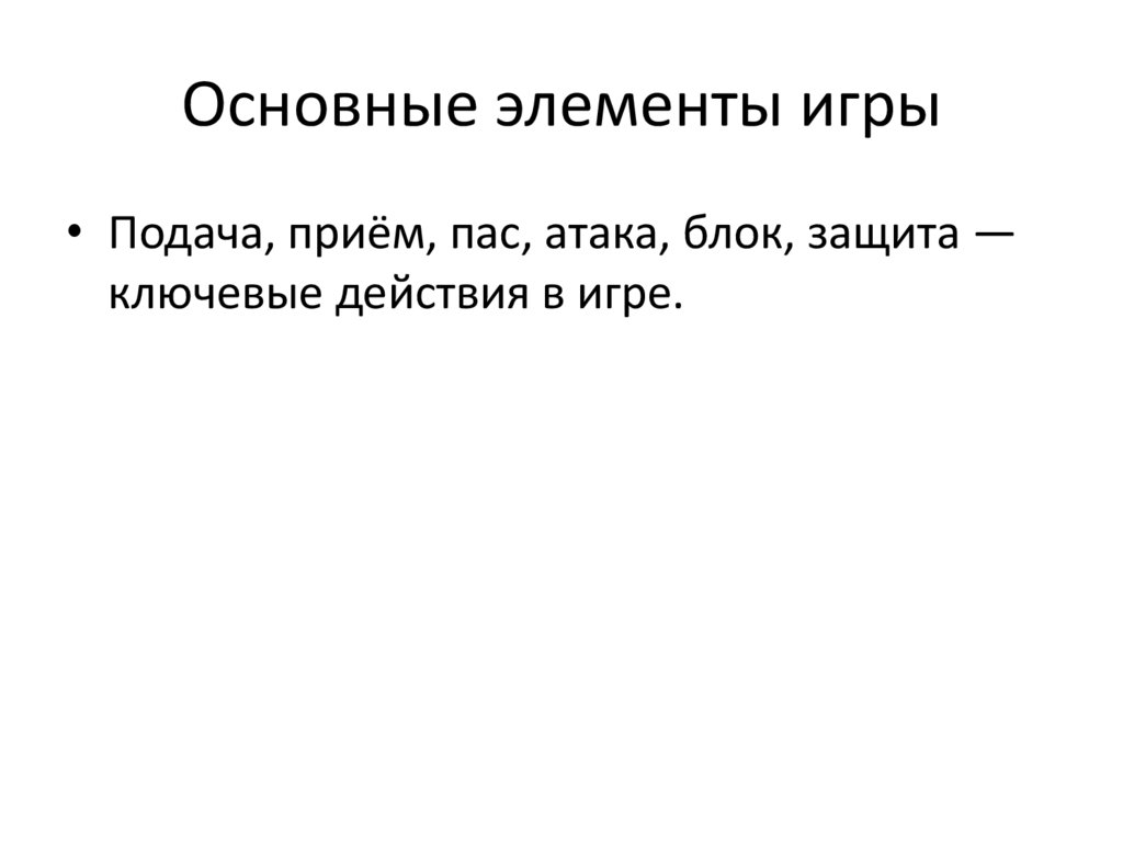 Основные элементы игры• Подача, приём, пас, атака, блок, защита —
