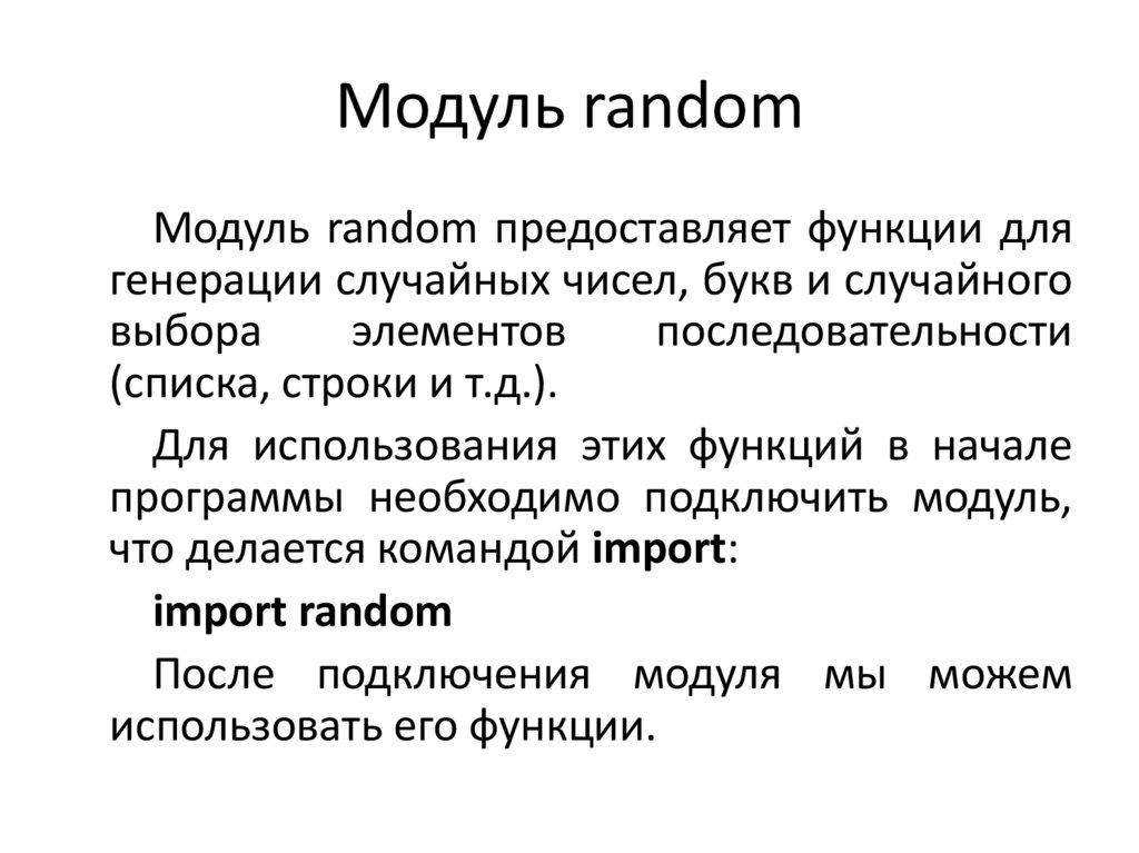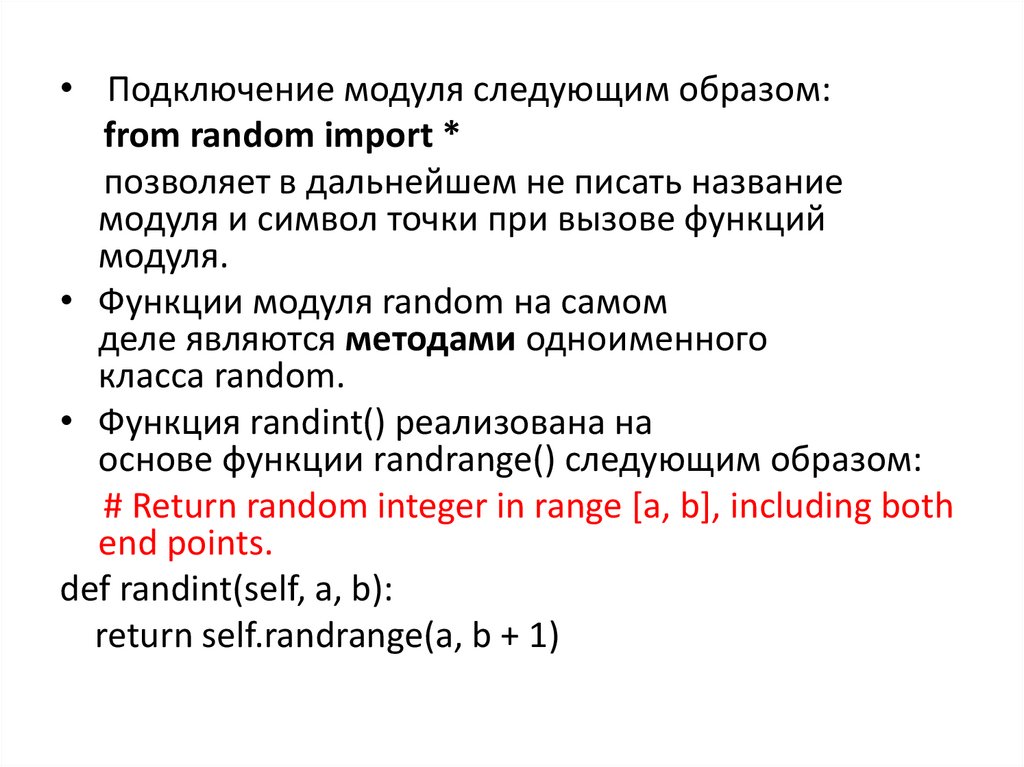 • Подключение модуля следующим образом:from random import *