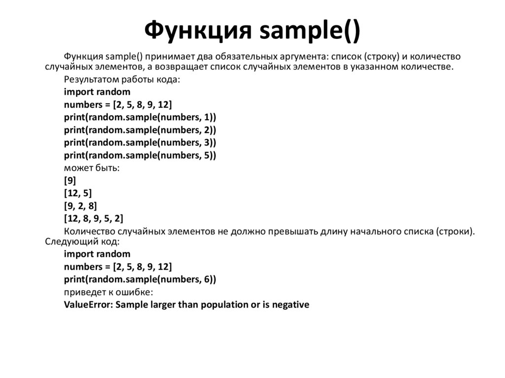 Функция sample() принимает два обязательных аргумента: список (строку) и количествослучайных элементов, а возвращает список случайных элементов в указанном количестве.