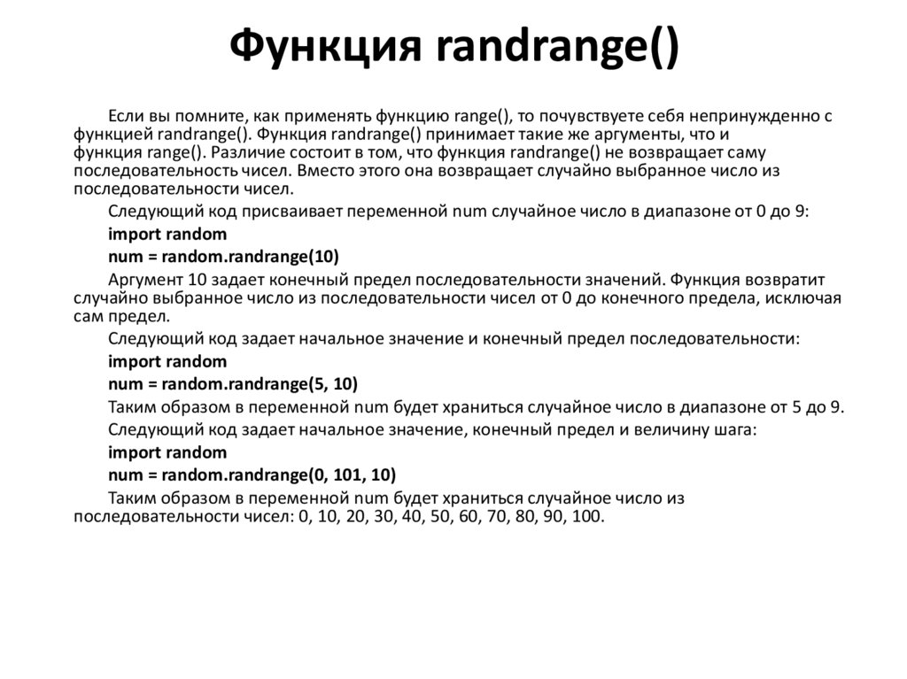 Если вы помните, как применять функцию range(), то почувствуете себя непринужденно сфункцией randrange(). Функция randrange() принимает такие же аргументы, что и