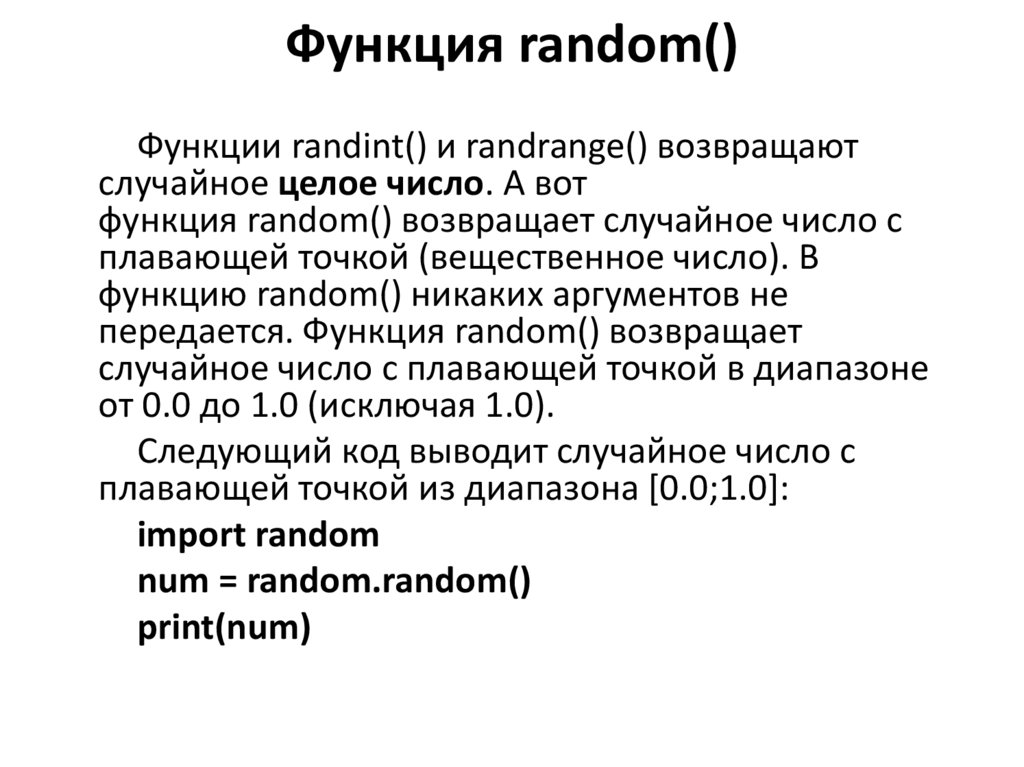 Функции randint() и randrange() возвращаютслучайное целое число. А вот
