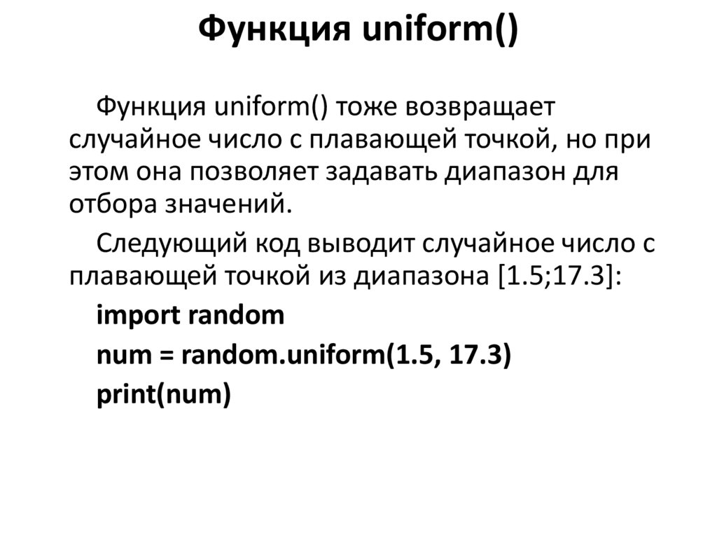 Функция uniform() тоже возвращаетслучайное число с плавающей точкой, но при