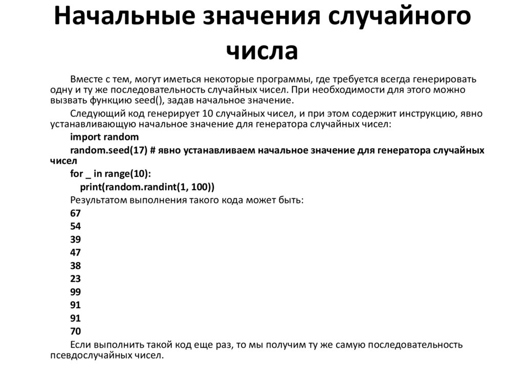 Числа, генерируемые функциями модуля random, не являютсяподлинно случайными. Несмотря на то, что обычно их называют