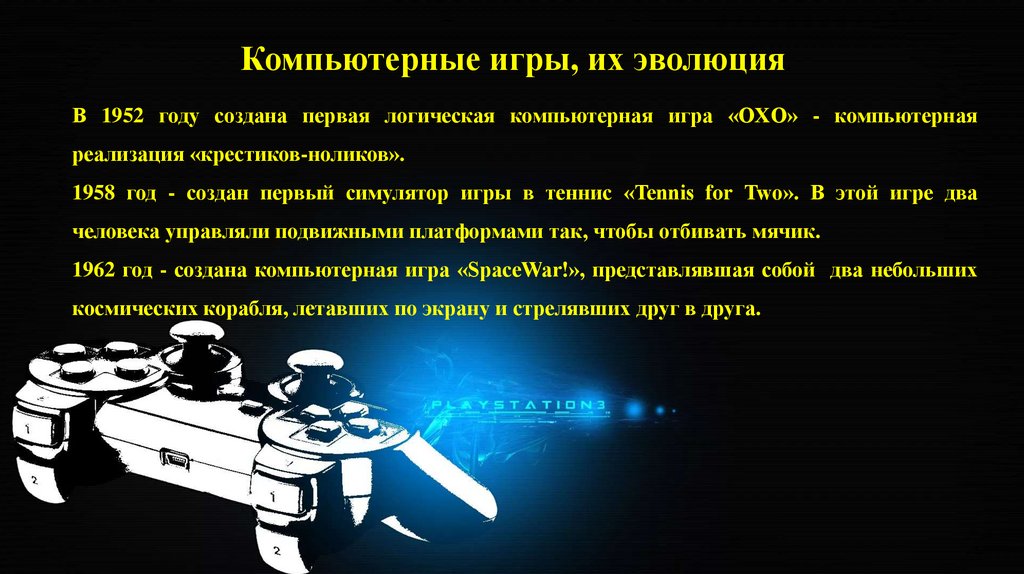 Компьютерные игры, их эволюция.В 1952 году создана первая логическая компьютерная игра «OXO» - компьютерная