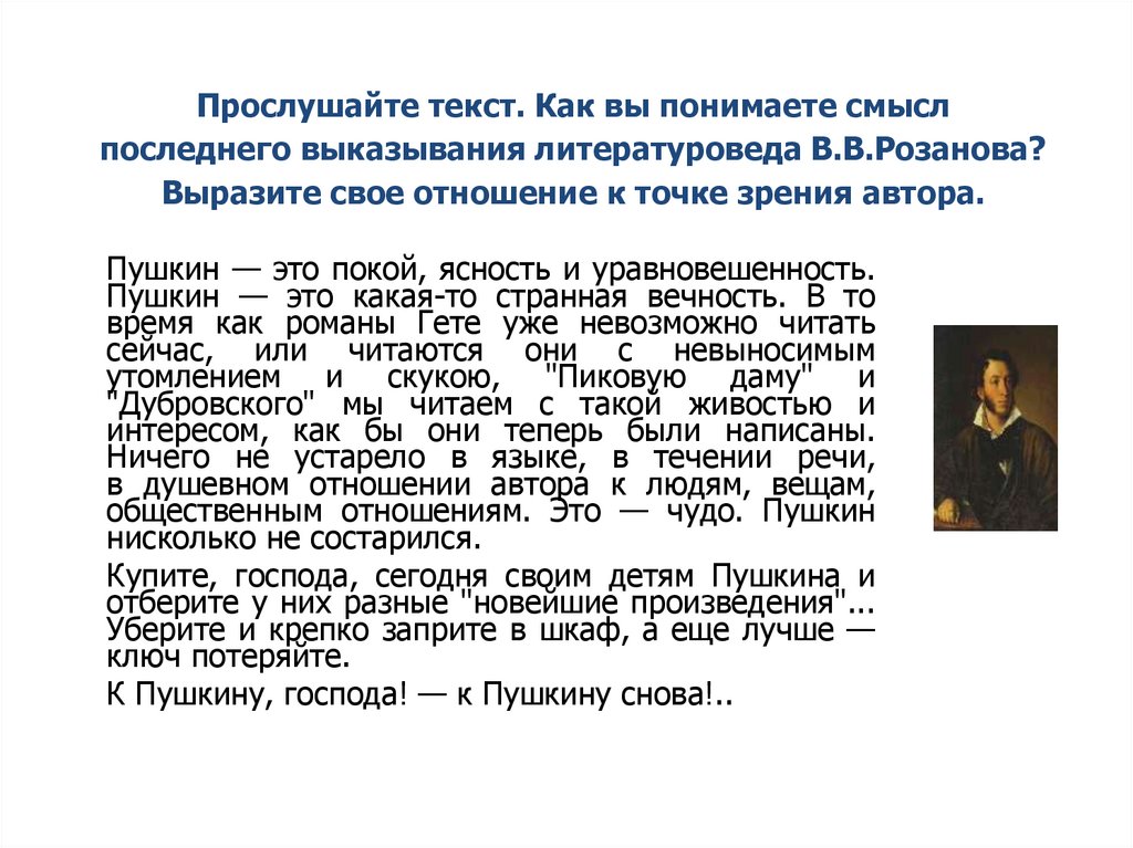 Прослушайте текст. Как вы понимаете смыслпоследнего выказывания литературоведа В.В.Розанова?