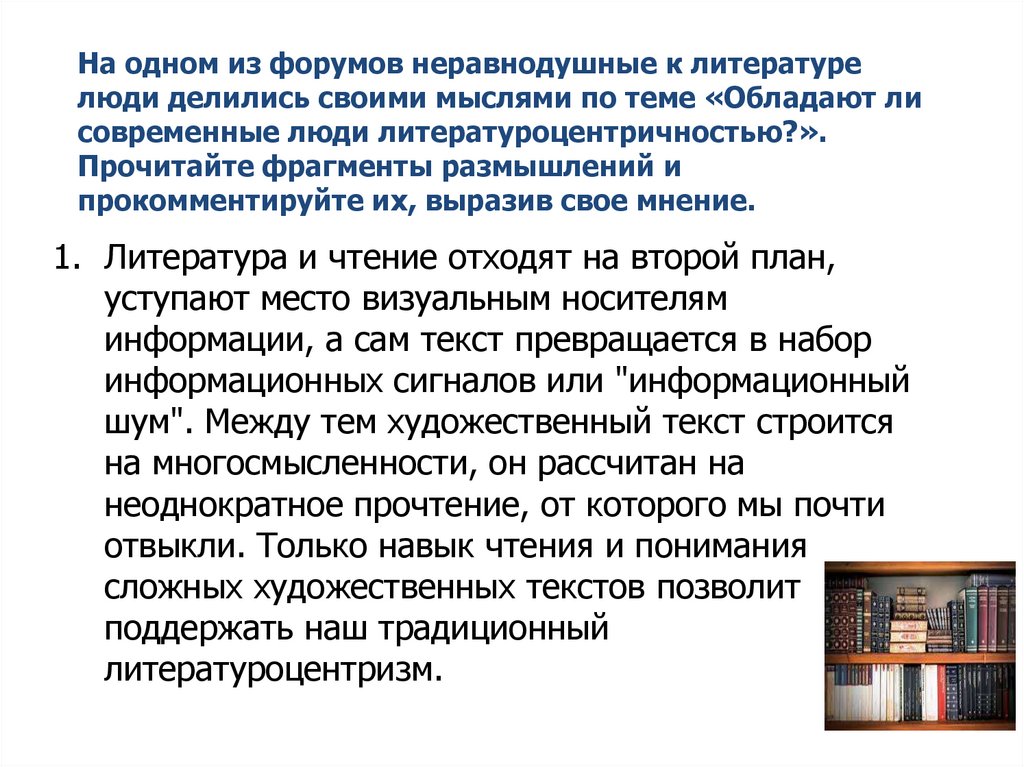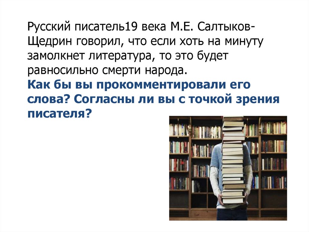 Русский писатель19 века М.Е. СалтыковЩедрин говорил, что если хоть на минутузамолкнет литература, то это будет