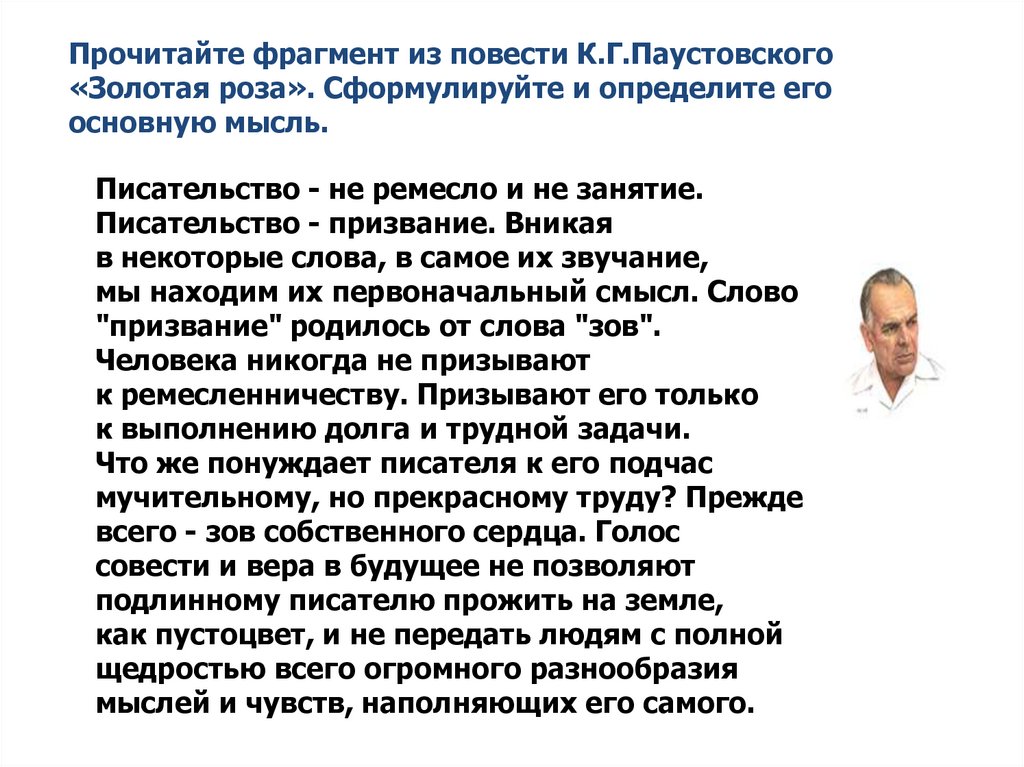 Прочитайте фрагмент из повести К.Г.Паустовского«Золотая роза». Сформулируйте и определите его