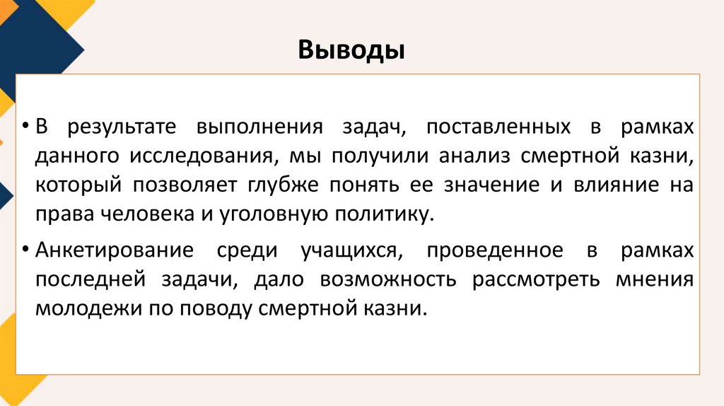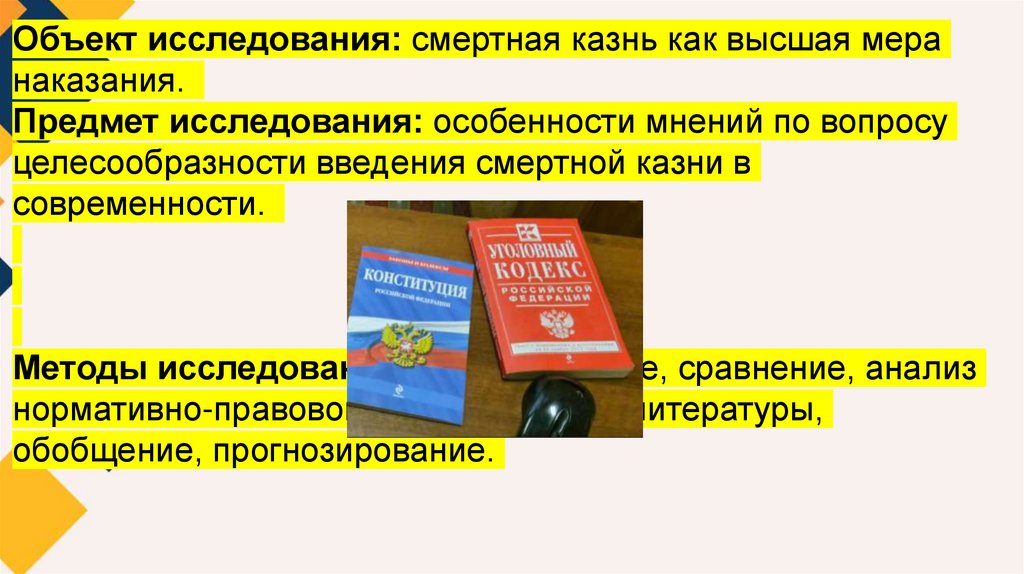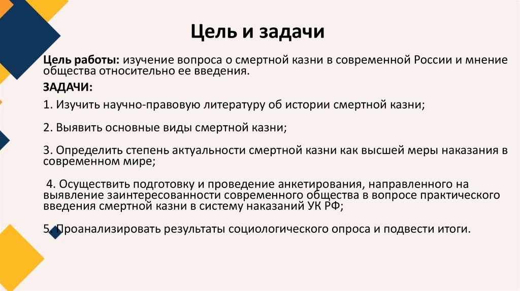 Цель и задачиЦель работы: изучение вопроса о смертной казни в современной России и мнение