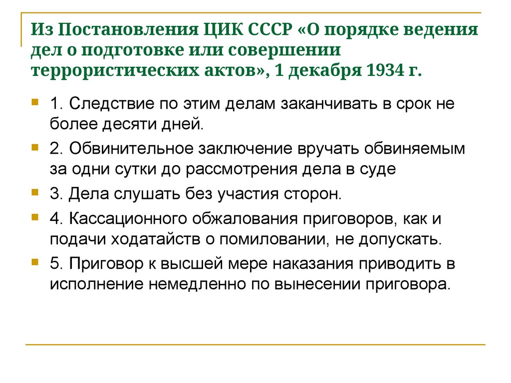 12. Из Постановления ЦИК СССР «О порядке ведения дел о подготовке или совершении террористических актов», 1 декабря 1934 г.