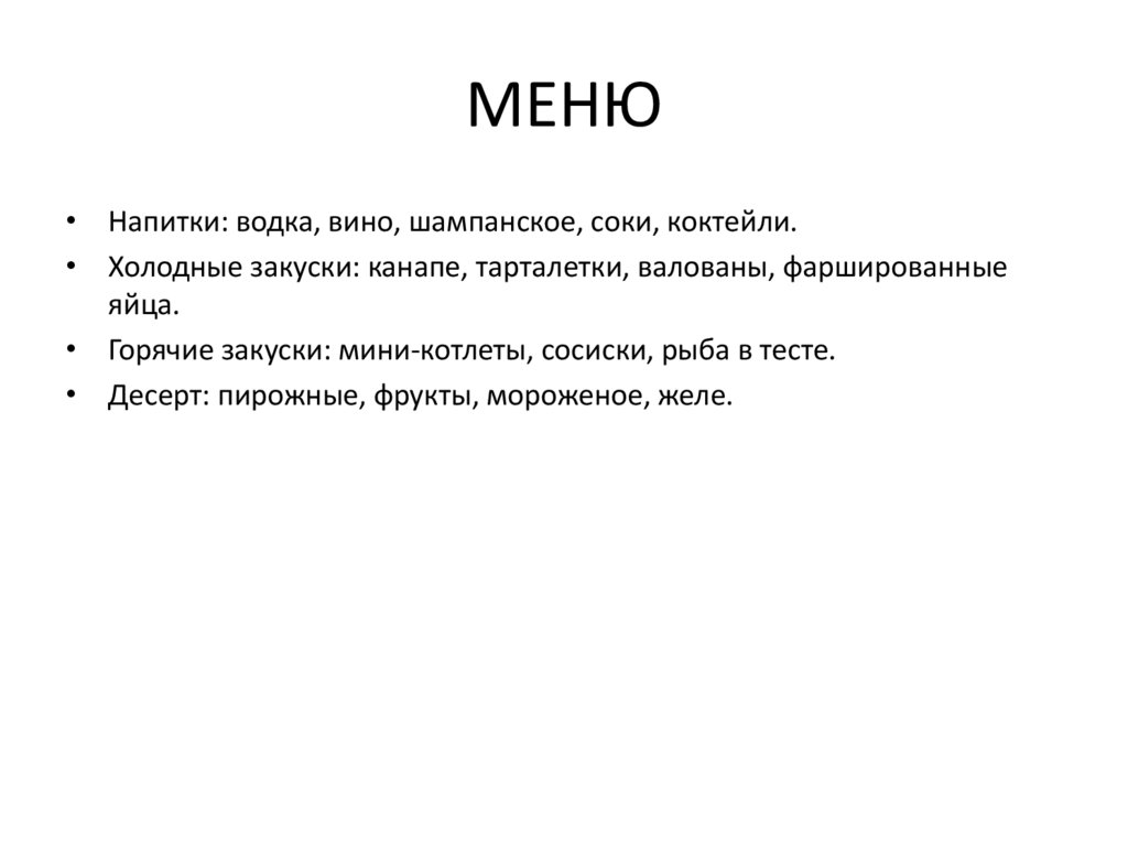 МЕНЮ• Напитки: водка, вино, шампанское, соки, коктейли.