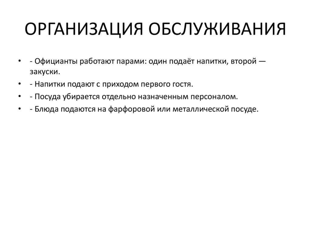 ОРГАНИЗАЦИЯ ОБСЛУЖИВАНИЯ• - Официанты работают парами: один подаёт напитки, второй —
