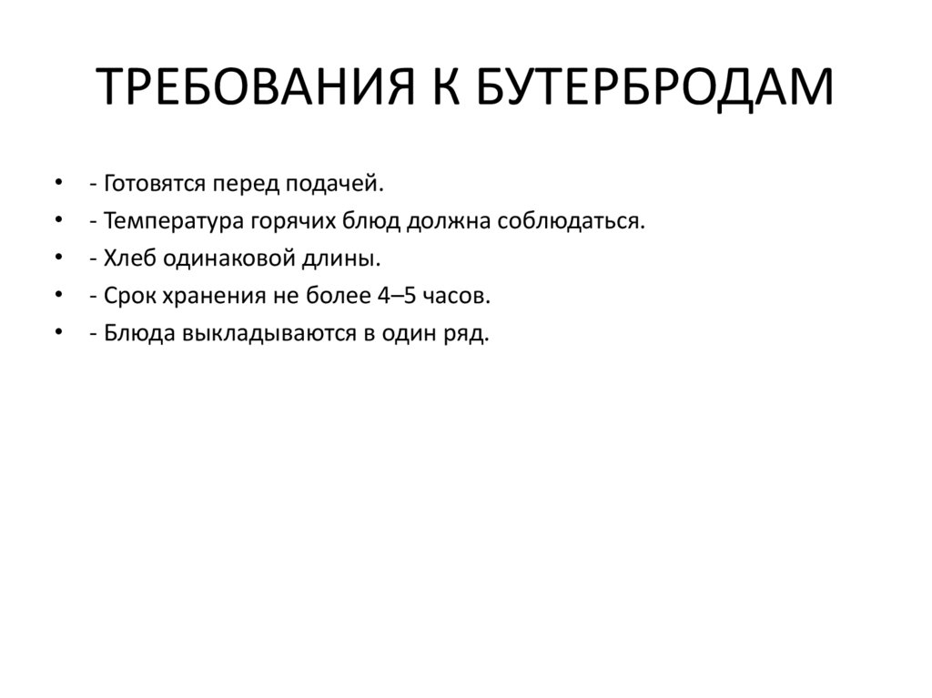 ТРЕБОВАНИЯ К БУТЕРБРОДАМ- Готовятся перед подачей.