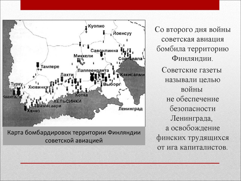 Карта бомбардировок территории Финляндиисоветской авиацией