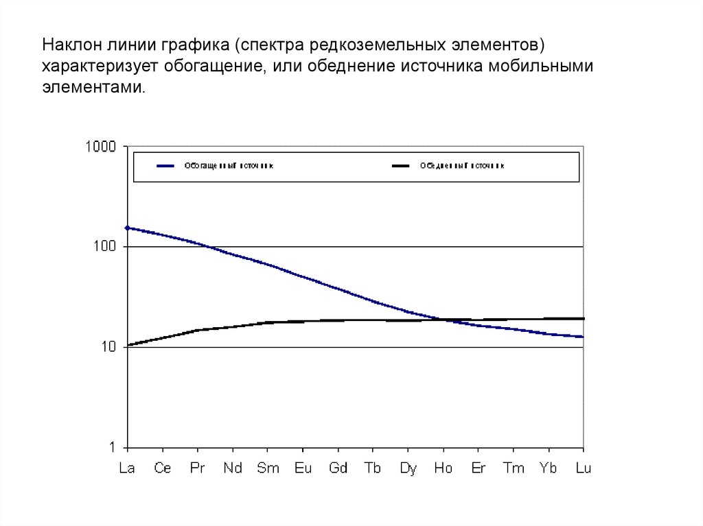 Наклон линии графика (спектра редкоземельных элементов)характеризует обогащение, или обеднение источника мобильными
