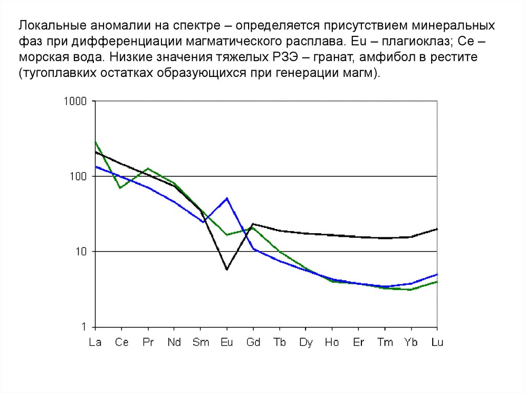 Локальные аномалии на спектре – определяется присутствием минеральныхфаз при дифференциации магматического расплава. Eu – плагиоклаз; Ce –