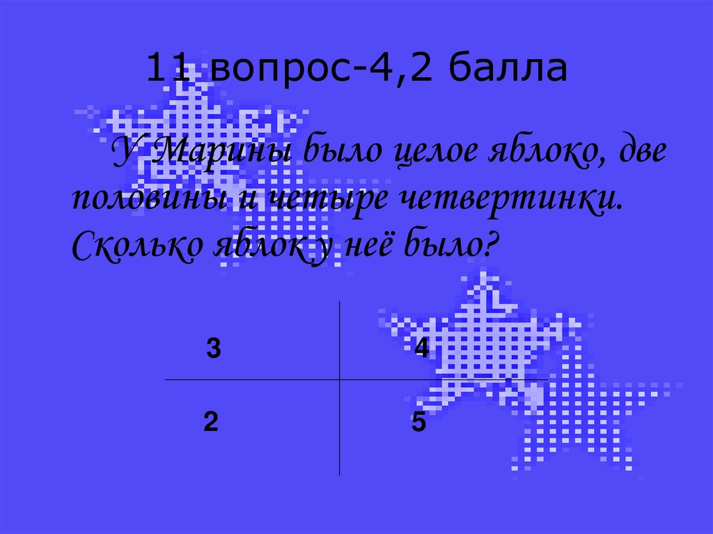 У Марины было целое яблоко, двеполовины и четыре четвертинки.