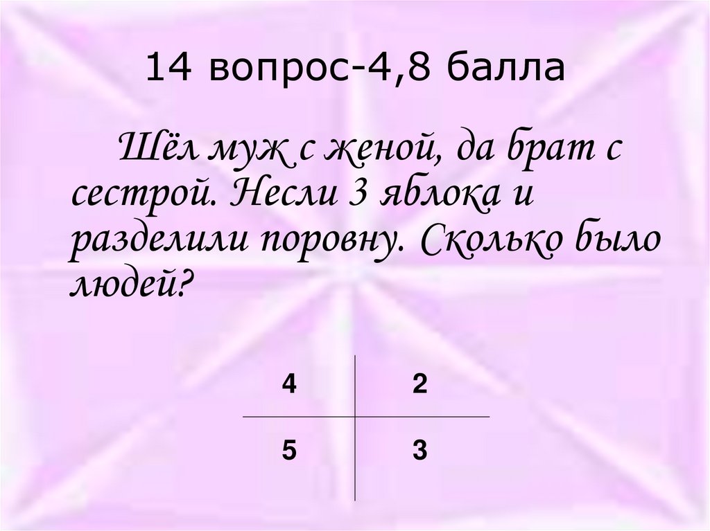 Шёл муж с женой, да брат ссестрой. Несли 3 яблока и