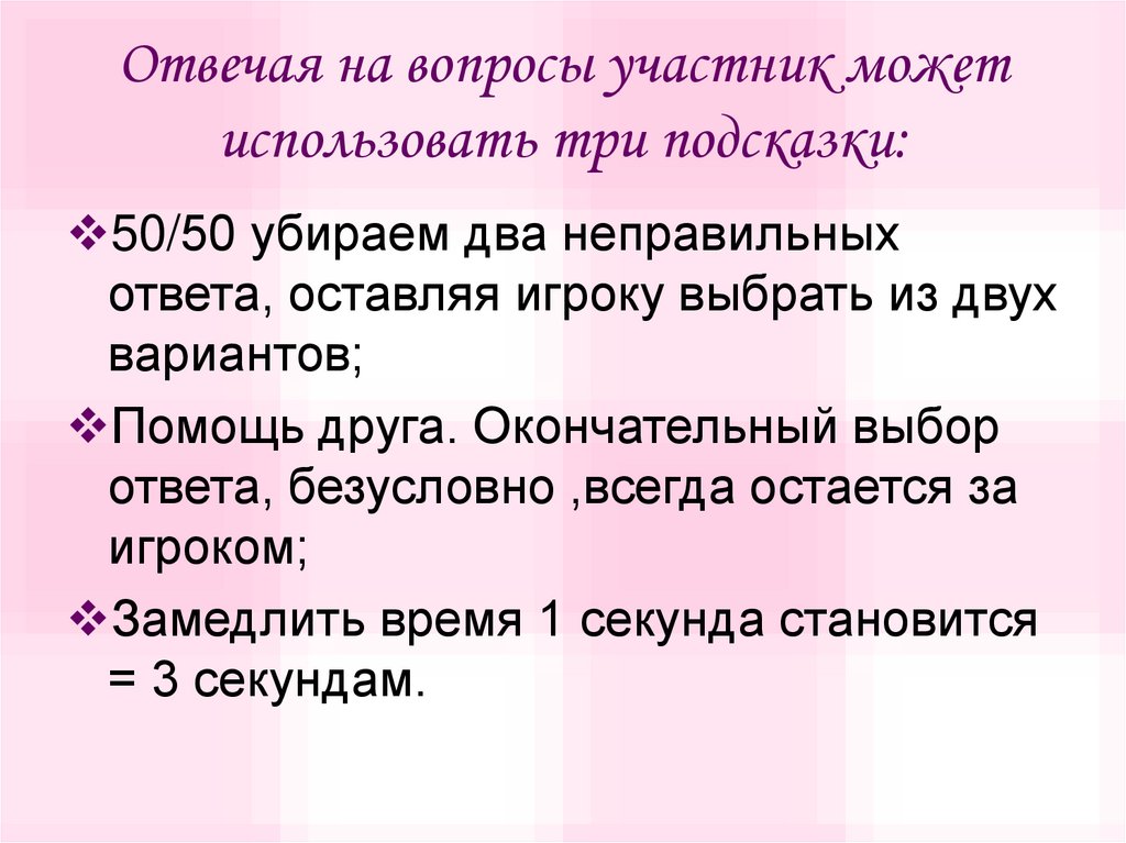 3. Отвечая на вопросы участник может использовать три подсказки:
