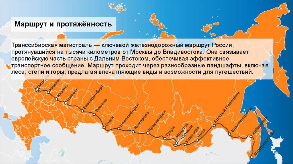 Маршрут и протяжённостьТранссибирская магистраль — ключевой железнодорожный маршрут России,